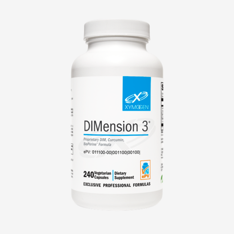 DIMension 3® represents a three-dimensional approach to supporting healthy estrogen metabolism. Research suggests that diindolylmethane (DIM), curcumin (from turmeric extract), and the patented black pepper extract BioPerine® support balanced estrogen metabolism.*